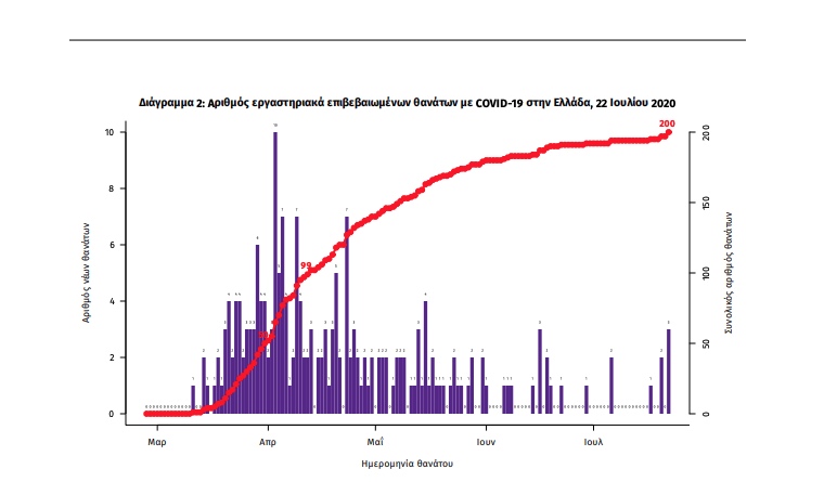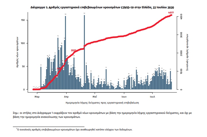 Τα στοιχεία που παρουσιάζονται αφορούν κρούσματα από την επιδημιολογική επιτήρηση της νόσου από το νέο κορoνοϊό (COVID19), με βάση τα δεδομένα που έχουν δηλωθεί στον ΕΟΔΥ και καταγραφεί μέχρι τις 22 Ιουλίου 2020 (ώρα 15:00).
