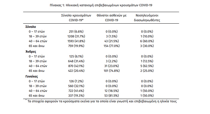 Από το σύνολο των 4077 κρουσμάτων, 1128 (27.7%) θεωρούνται σχετιζόμενα με ταξίδι από το εξωτερικό, 2066 (50.7%) είναι σχετιζόμενα με ήδη γνωστό κρούσμα και τα υπόλοιπα δεν σχετίζονται ούτε με ταξίδι ούτε με άλλο γνωστό κρούσμα ή είναι ακόμα υπό διερεύνηση. Η μέση ηλικία των κρουσμάτων είναι 47 έτη (εύρος 0 έως 102 ετών), ενώ η μέση ηλικία των θανάτων είναι 76 έτη (εύρος 35 έως 102 ετών). Η ηλικιακή κατανομή των (α) συνολικών κρουσμάτων, (β) των περιστατικών που κατέληξαν σε θάνατο και (γ) των ασθενών που νοσηλεύονται διασωληνωμένοι, είναι η ακόλουθη: