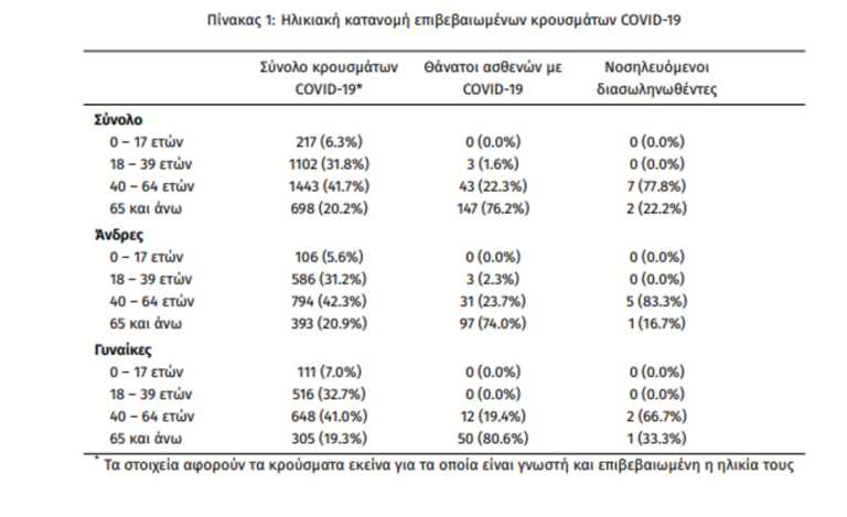 Η μέση ηλικία των κρουσμάτων είναι 47 έτη (εύρος 0 έως 102 ετών), ενώ η μέση ηλικία των θανάτων είναι 76 έτη (εύρος 35 έως 102 ετών). Η ηλικιακή κατανομή των (α) συνολικών κρουσμάτων, (β) των περιστατικών που κατέληξαν σε θάνατο και (γ) των ασθενών που νοσηλεύονται διασωληνωμένοι, είναι η ακόλουθη: