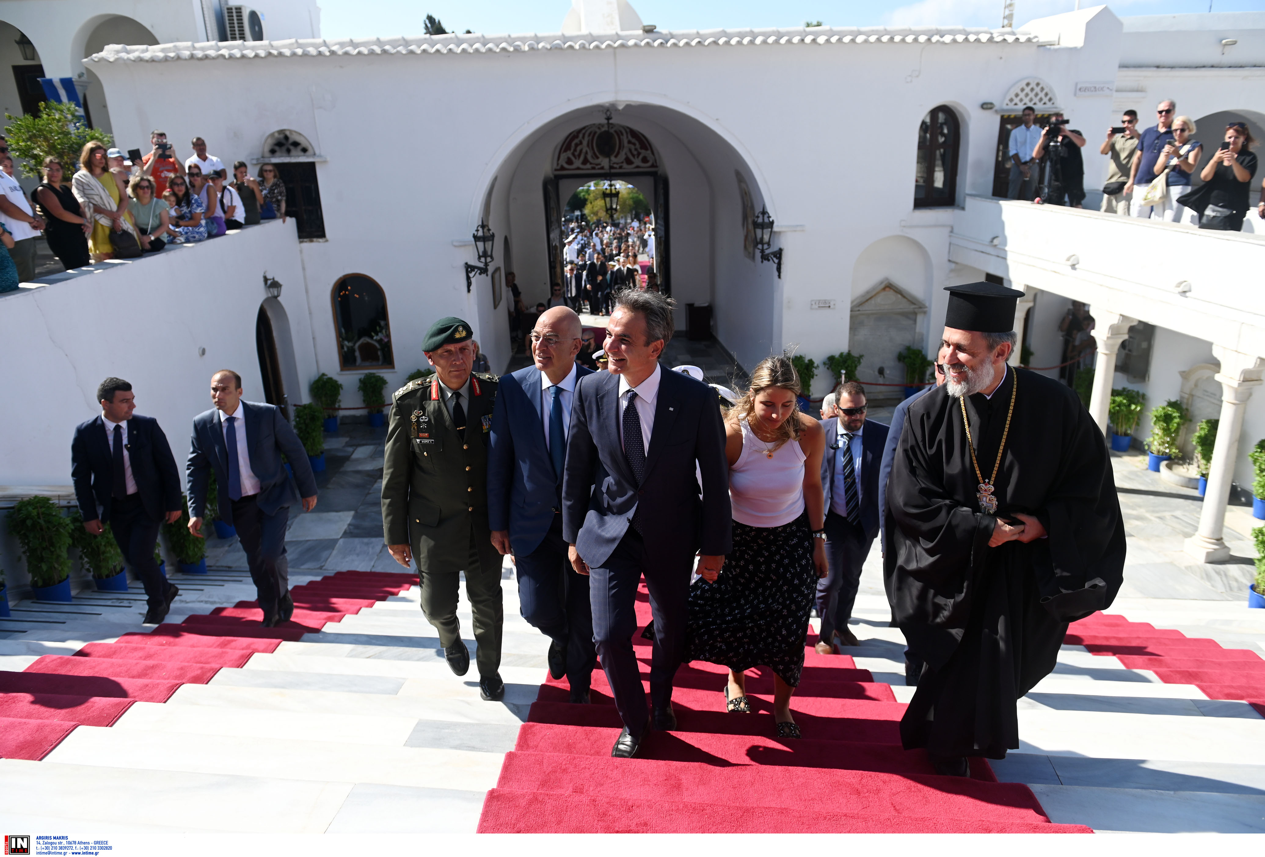 O πρωθυπουργός Κυριάκος Μητσοτάκης, ο Υπουργός Εθνικής Άμυνας Νίκος Δένδιας και ο Αρχηγός ΓΕΕΘΑ Στρατηγός Κωνσταντίνος Φλώρος παρευρίσκονται σήμερα στην Τήνο, για τον εορτασμό της Κοιμήσεως της Θεοτόκου και στις εκδηλώσεις για την επέτειο του τορπιλισμού του καταδρομικού «Έλλη».