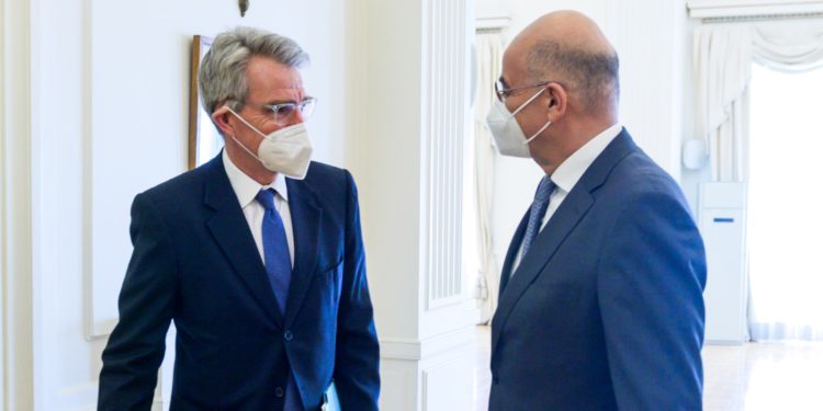 Συνάντηση με τον Αμερικανό πρέσβη Τζέφρι Πάιατ πραγματοποίησε νωρίτερα σήμερα στο υπουργείο Εξωτερικών ο υπουργός Εξωτερικών Νίκος Δένδιας, υπό το φόντο των πρόσφατων εξελίξεων αναφορικά με το non paper του Στέιτ Ντιπάρτμεντ για το πρόγραμμα κατασκευής αγωγού φυσικού αερίου «East Med» και τις μετέπειτα διευκρινίσεις του αμερικανικού Υπουργείου Εξωτερικών.