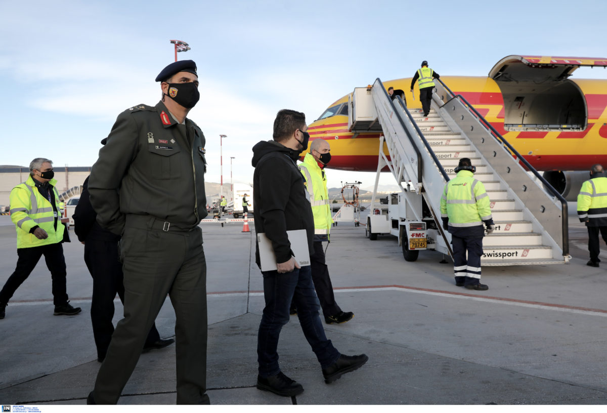 Κλιμάκιο του υπουργείου Υγείας και της Πολιτικής Προστασίας με επικεφαλής τον υφυπουργό Πολιτικής Προστασίας και Διαχείρισης Κρίσεων, Νίκο Χαρδαλιά, καθώς και εκπρόσωποι των Ενόπλων Δυνάμεων, της Αστυνομίας και της Πυροσβεστικής βρίσκονται στο αεροδρόμιο προκειμένου να παραλάβουν τις δόσεις του εμβολίου.