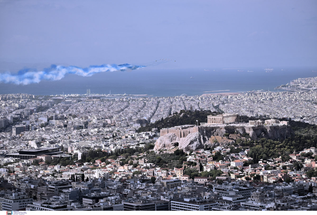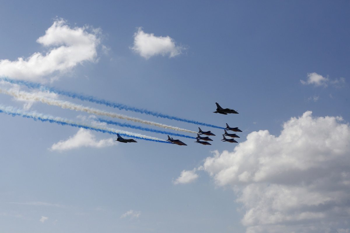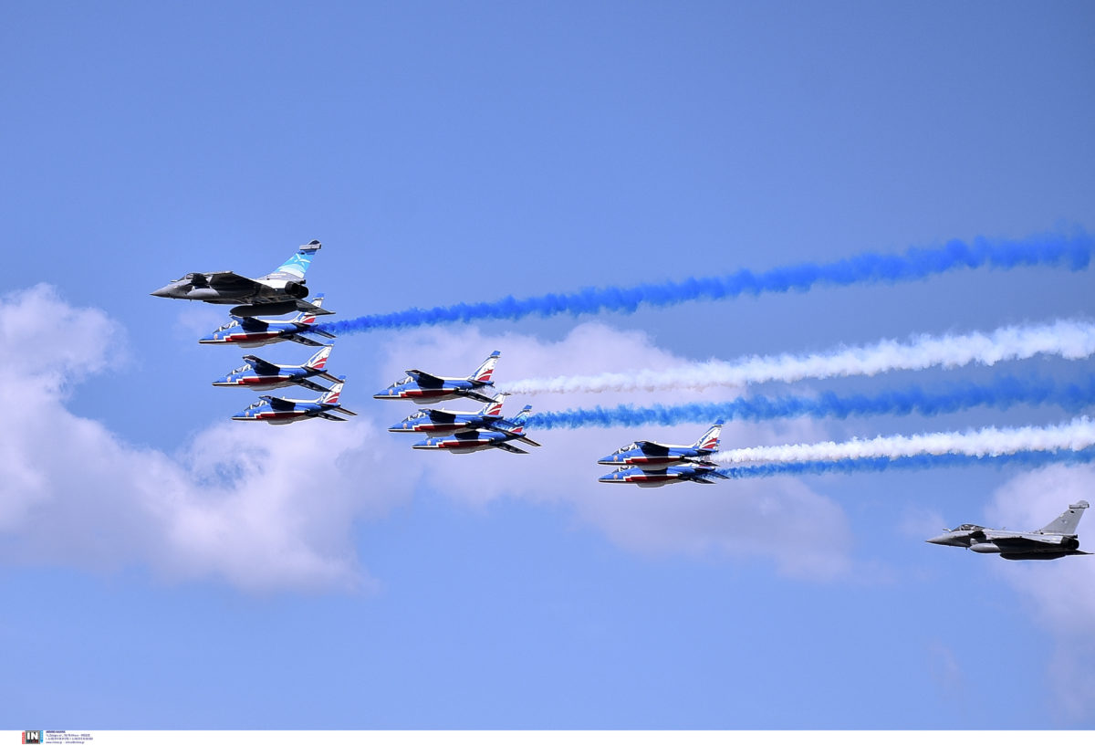 Όπως έχει γίνει και σε ανάλογες περιπτώσεις, αλλά και κατά τη διάρκεια του διήμερου airshow στην Τανάγρα, τα γαλλικά αεροσκάφη «έβαψαν» τον ουρανό πλησιάζοντας τον Παρθενώνα στα χρώματα της γαλανόλευκης.
