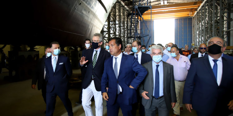 Ο υπουργός και ο υφυπουργός, Νίκος Παπαθανάσης επισκέφθηκαν τις εγκαταστάσεις των ναυπηγείων συνοδευόμενοι από τον Πρέσβη των ΗΠΑ στην Ελλάδα, Geoffrey Pyatt και τον πρόεδρο της ΟΝΕΧ, Πάνο Ξενοκώστα. Σύμφωνα με τον κ. Γεωργιάδη, η ONEX Shipyards εξασφάλισε τη χρηματοδότηση από τον αμερικανικό οργανισμό στρατηγικών επενδύσεων, DFC ,προκειμένου να προχωρήσει στην απόκτηση των Ναυπηγείων Ελευσίνας κατά το επιτυχημένο μοντέλο εξυγίανσης των ναυπηγείων στο Νεώριο Σύρου, τα οποία ήδη έχει εξαγοράσει η ONEX. Όπως εξήγησε ο υπουργός για να προχωρήσει το σχέδιο εξυγίανσης της Ελευσίνας απαιτείται η μεταβίβαση των μετοχών των ναυπηγείων από τον μεγαλομέτοχο Ν. Ταβουλάρη. «Πρέπει να πάμε με τη σύμφωνη γνώμη του κύριου Ταβουλάρη να μεταβιβάσουμε τις μετοχές στην ΟΝΕΧ και να συμφωνήσει το ελληνικό δημόσιο, δηλαδή εμείς και οι τράπεζες, να πάμε στο δικαστήριο με τη διαδικασία του 106Β και να εγκριθεί το επενδυτικό σχήμα βάσει του ελληνικού νόμου, όπως ακριβώς έγινε και με το Νεώριο της Σύρου», δήλωσε ο υπουργός Ανάπτυξης.