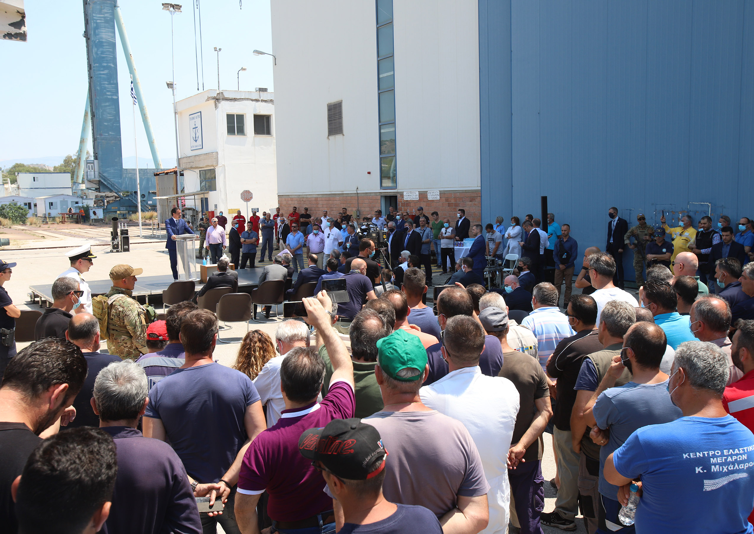 Ο υπουργός και ο υφυπουργός, Νίκος Παπαθανάσης επισκέφθηκαν τις εγκαταστάσεις των ναυπηγείων συνοδευόμενοι από τον Πρέσβη των ΗΠΑ στην Ελλάδα, Geoffrey Pyatt και τον πρόεδρο της ΟΝΕΧ, Πάνο Ξενοκώστα. Σύμφωνα με τον κ. Γεωργιάδη, η ONEX Shipyards εξασφάλισε τη χρηματοδότηση από τον αμερικανικό οργανισμό στρατηγικών επενδύσεων, DFC ,προκειμένου να προχωρήσει στην απόκτηση των Ναυπηγείων Ελευσίνας κατά το επιτυχημένο μοντέλο εξυγίανσης των ναυπηγείων στο Νεώριο Σύρου, τα οποία ήδη έχει εξαγοράσει η ONEX. Όπως εξήγησε ο υπουργός για να προχωρήσει το σχέδιο εξυγίανσης της Ελευσίνας απαιτείται η μεταβίβαση των μετοχών των ναυπηγείων από τον μεγαλομέτοχο Ν. Ταβουλάρη. «Πρέπει να πάμε με τη σύμφωνη γνώμη του κύριου Ταβουλάρη να μεταβιβάσουμε τις μετοχές στην ΟΝΕΧ και να συμφωνήσει το ελληνικό δημόσιο, δηλαδή εμείς και οι τράπεζες, να πάμε στο δικαστήριο με τη διαδικασία του 106Β και να εγκριθεί το επενδυτικό σχήμα βάσει του ελληνικού νόμου, όπως ακριβώς έγινε και με το Νεώριο της Σύρου», δήλωσε ο υπουργός Ανάπτυξης.