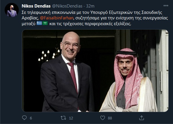 Τηλεφωνική επικοινωνία με τον Σαουδάραβα ομόλογό του, πρίγκιπα Φάισαλ μπιν Φαρχάν αλ Σαούντ (Faisal bin Farhan Al Saud) είχε νωρίτερα ο υπουργός Εξωτερικών, Νίκος Δένδιας.