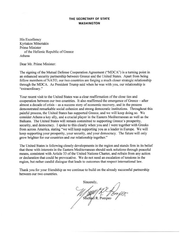 Δείτε την επιστολή του Αμερικανού ΥΠΕΞ, Μάικ Πομπέο, προς τον Έλληνα πρωθυπουργό, Κυριάκο Μητσοτάκη: