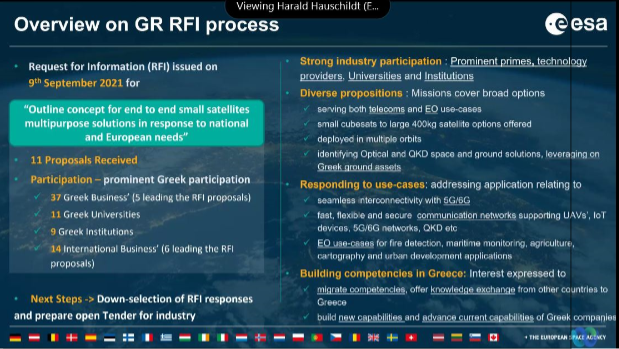 Ειδικότερα, το ΥΨΗΔ μέσω της έκδοσης της ανοιχτής πρόσκλησης για προτάσεις ενδιαφέροντος (Πρόσκληση RFI), κινητοποίησε ηγέτιδες εταιρίες (Large Systems Integrators και Primes) της Ευρωπαϊκής Διαστημικής αγοράς οι οποίες κατέθεσαν προτάσεις με την εξαιρετικά αυξημένη συμμετοχή της εγχώριας διαστημικής βιομηχανίας. Συνολικά, με βάση τα αποτελέσματα που ανακοινώθηκαν κατατέθηκαν 11 προτάσεις από τις οποίες 5 ηγούνται από Ελληνικές εταιρίες!