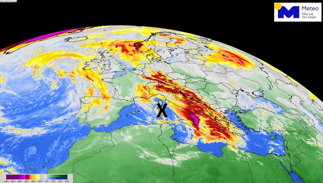 Η έντονη κακοκαιρία αναμένεται να επηρεάσει τη χώρα μας με ισχυρές βροχές και καταιγίδες και πολύ θυελλώδεις νοτιάδες έως την Τρίτη. Οι δορυφορικές εικόνες δείχνουν ένα εκτεταμένο βαρομετρικό χαμηλό που σχετίζεται με την κακοκαιρία, το οποίο τις πρωινές ώρες της Κυριακής είχε κέντρο στην Κορσική.