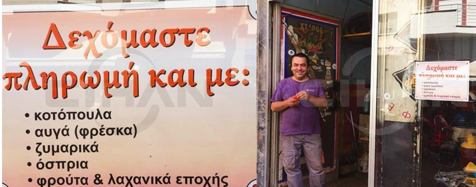 Σύμφωνα με τα δημοσιεύματα οι πληροφορίες των οποίων αντλήθηκαν από ρεπορτάζ την θρακιώτικης τοπικής εφημερίδας «Χρόνος», ο μηχανικός μοτοσικλετών, κ. Δαμιανός Βουσβούκης, που διατηρεί σχετικό συνεργείο, παρουσιάζει εναλλακτική περίπτωση στους πελάτες του, που δεν έχουν ρευστό λόγω της κατάσταση των τραπεζών: Έτσι σε χαρτί που ανάρτησε στο κατάστημά του αναφέρει ότι δίνει στους πελάτες του τη δυνατότητα πληρωμής και με τα προαναφερθέντα τρόφιμα.