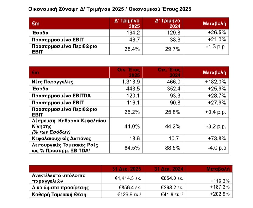 Καταγράψαμε αύξηση νέων παραγγελιών άνω του 180%, ενώ τα Έσοδα και το Προσαρμοσμένο EBIT ενισχύθηκαν κατά περισσότερο από 25% σε σχέση με τη χρήση 2024. Πολλές από τις πρωτοβουλίες μας ως πρωτοπόροι (early‑movers) δικαιώθηκαν, όπως η επένδυση στην Exosens, η θωράκιση της εφοδιαστικής μας αλυσίδας και οι στοχευμένες επενδύσεις ή συνεργασίες με τις κατάλληλες εταιρίες.