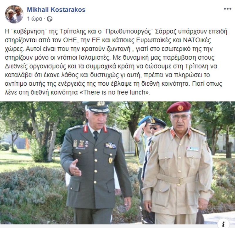 Γράφει ο Στρατηγός Κωσταράκος: «Η ‘κυβέρνηση’ της Τρίπολοης και ο ‘πρωθυπουργός’ Σάρραζ υπάρχουν επειδή στηρίζονται από τον ΟΗΕ, την ΕΕ και κάποιες Ευρωπαϊκές και ΝΑΤΟικές χώρες. Αυτοί είναι που την κρατούν ζωντανή, γιατί στο εσωτερικό της την στηρίζουν μόνο οι ντόπιοι Ισλαμιστές. Με δυναμική μας παρέμβαση στους Διεθνείς οργανισμούς και τα συμμαχικά κράτη να δώσουμε στη Τρίπολη να καταλάβει ότι έκανε λάθος και δυστυχώς γι αυτή, πρέπει να πληρώσει το αντίτιμο αυτής της ενέργειάς της που έβλαψε τη διεθνή κοινότητα. Γιατί όπως λένε στη διεθνή κοινότητα «There is no free lunch»».