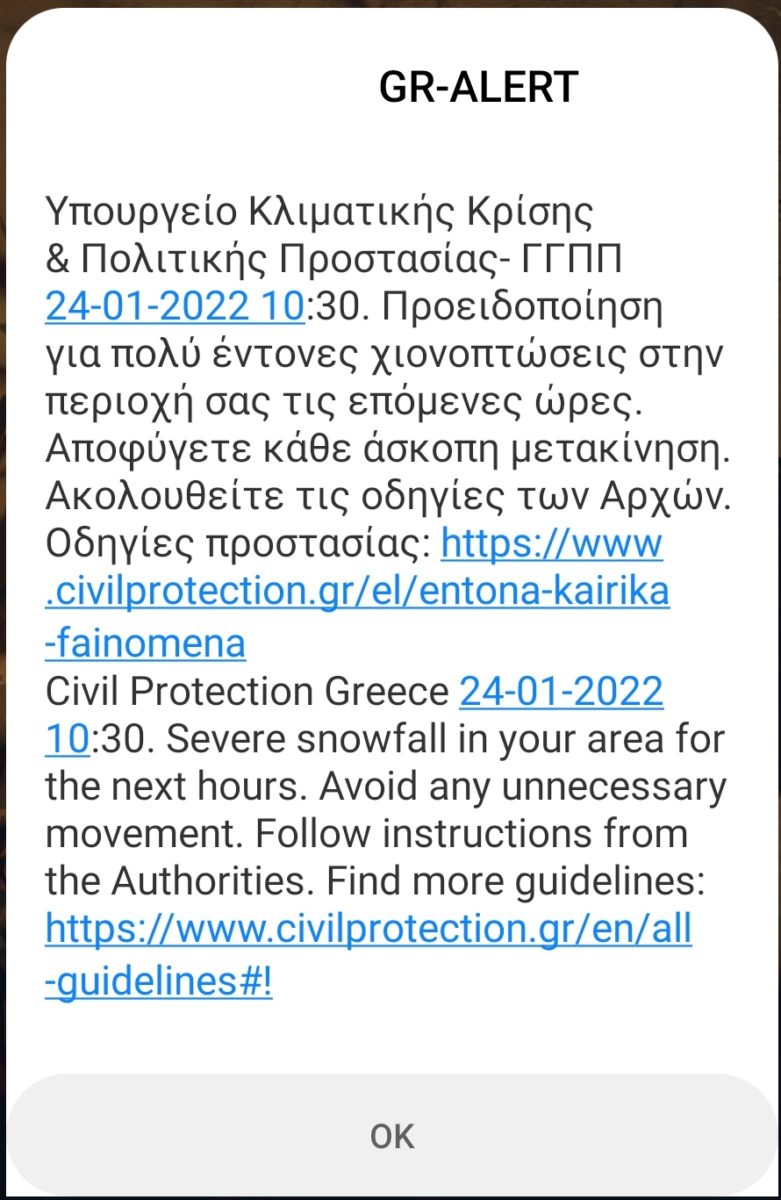 Συγκεκριμένα, το μήνυμα αναφέρει: «Προειδοποίηση για πολύ έντονες χιονοπτώσεις στην περιοχή σας τις επόμενες ώρες. Αποφύγετε κάθε άσκοπη μετακίνηση. Ακολουθείτε τις οδηγίες των αρχών».
