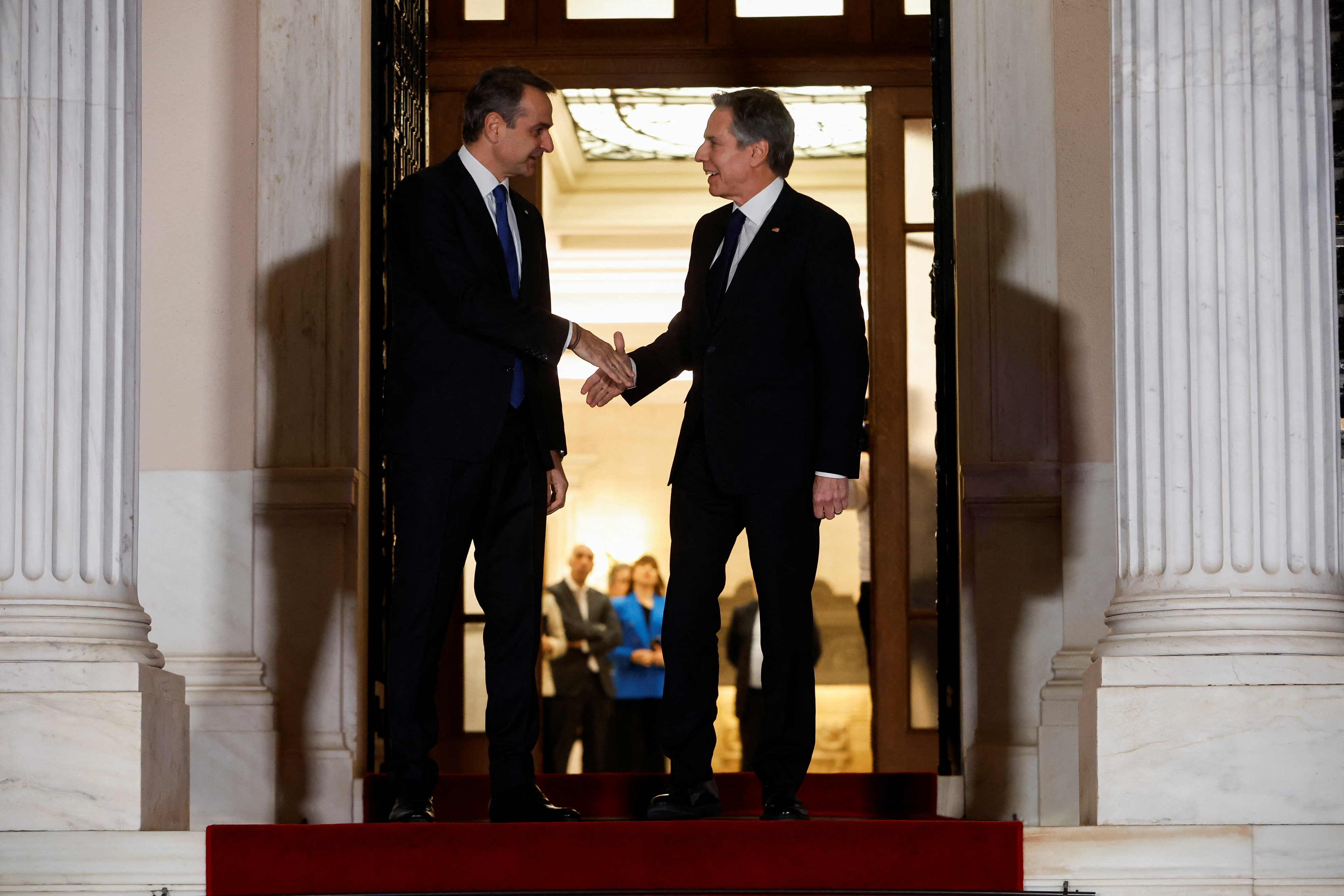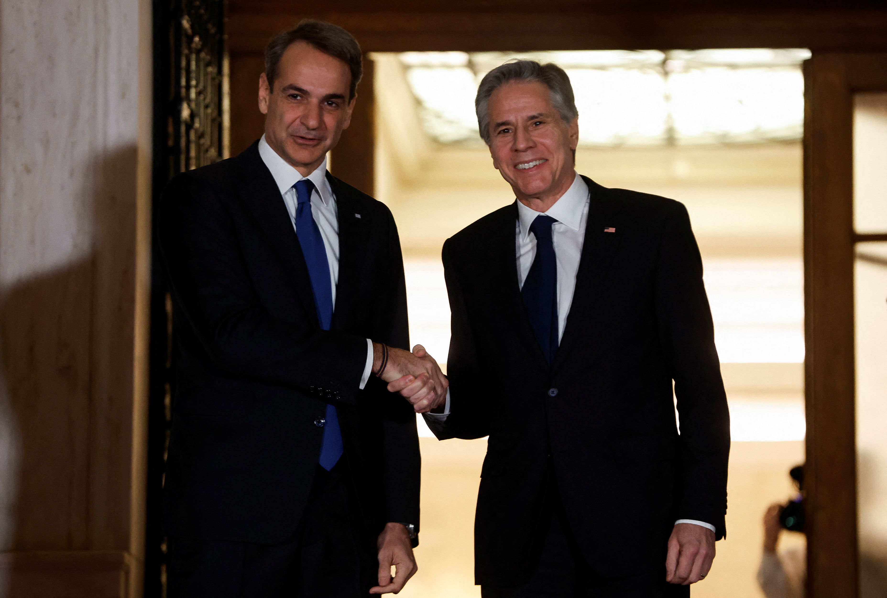 Κατά την έναρξη του τετ α τετ με τον Κυριάκο Μητσοτάκη, ο Άντονι Μπλίνκεν ευχαρίστησε την Ελλάδα για την βοήθεια που έστειλε στην Ουκρανία, ενώ βλέποντας μια φωτογραφία του Έλληνα πρωθυπουργού από την ομιλία του στο Κογκρέσο, σχολίασε ότι «δεν θα ξεχάσω πόσο με είχε συγκινήσει». Πρόσθεσε, ότι «η σχέση της Ελλάδας με τις ΗΠΑ δεν ήταν ποτέ σε τόσο καλό επίπεδο» και πως «για τις ΗΠΑ, η Ελλάδα είναι πυλώνας σταθερότητας για την Ανατολική Μεσόγειο και τα Βαλκάνια».