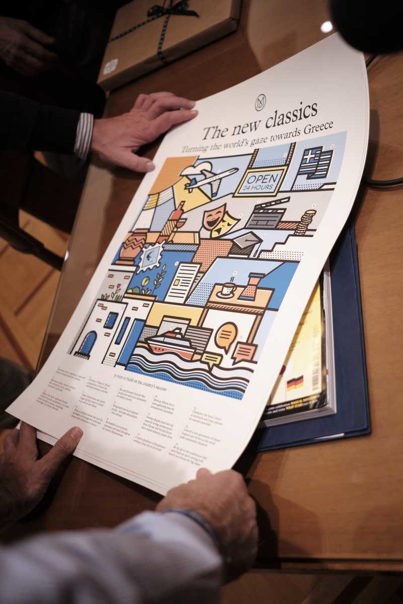 Οι Tyler Brûlé και Andrew Tuck, διευθυντής σύνταξης και αρχισυντάκτης του περιοδικού αντίστοιχα, βρέθηκαν στο Μέγαρο Μαξίμου και κάθισαν στο ίδιο τραπέζι με τον Κυριάκο Μητσοτάκη.