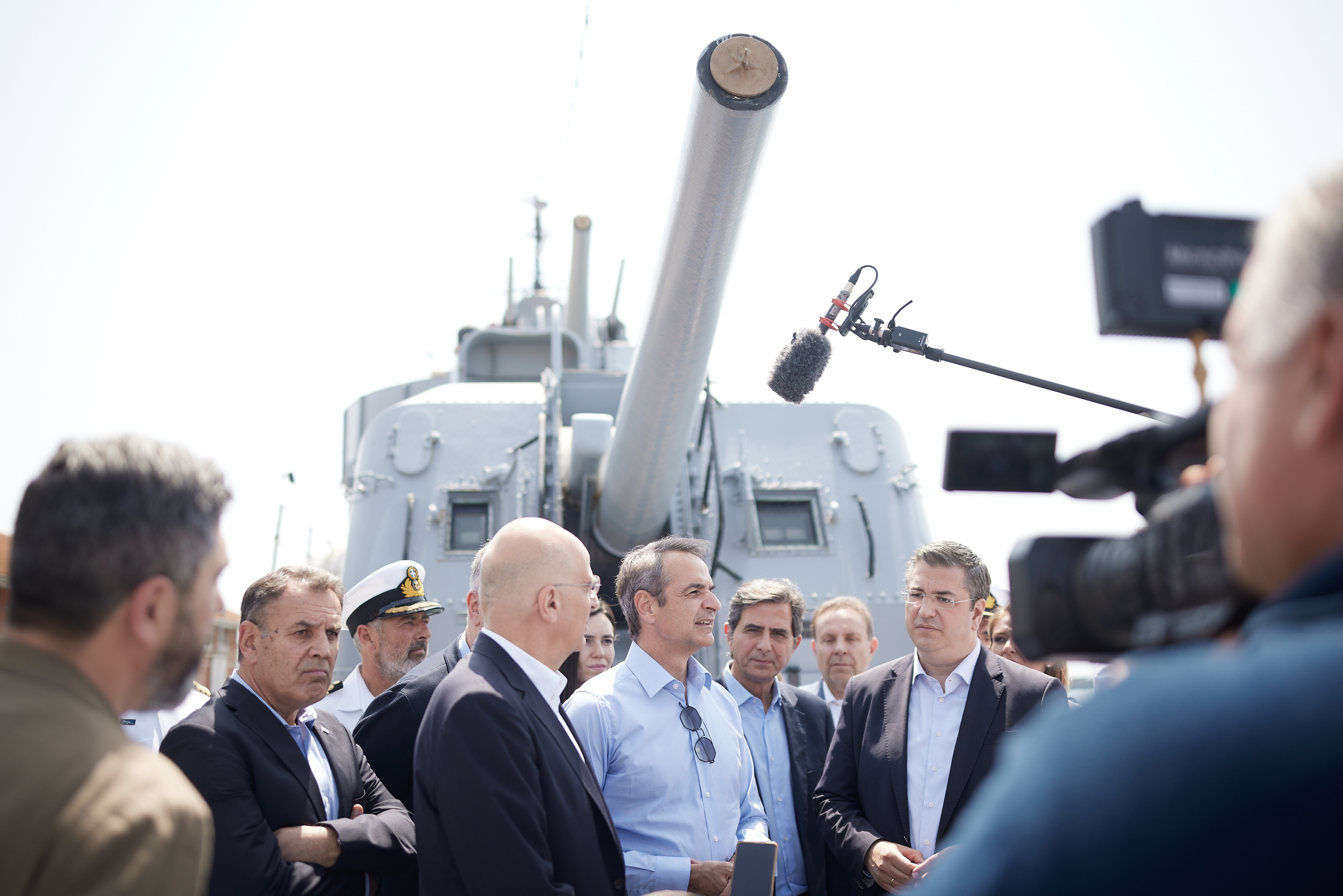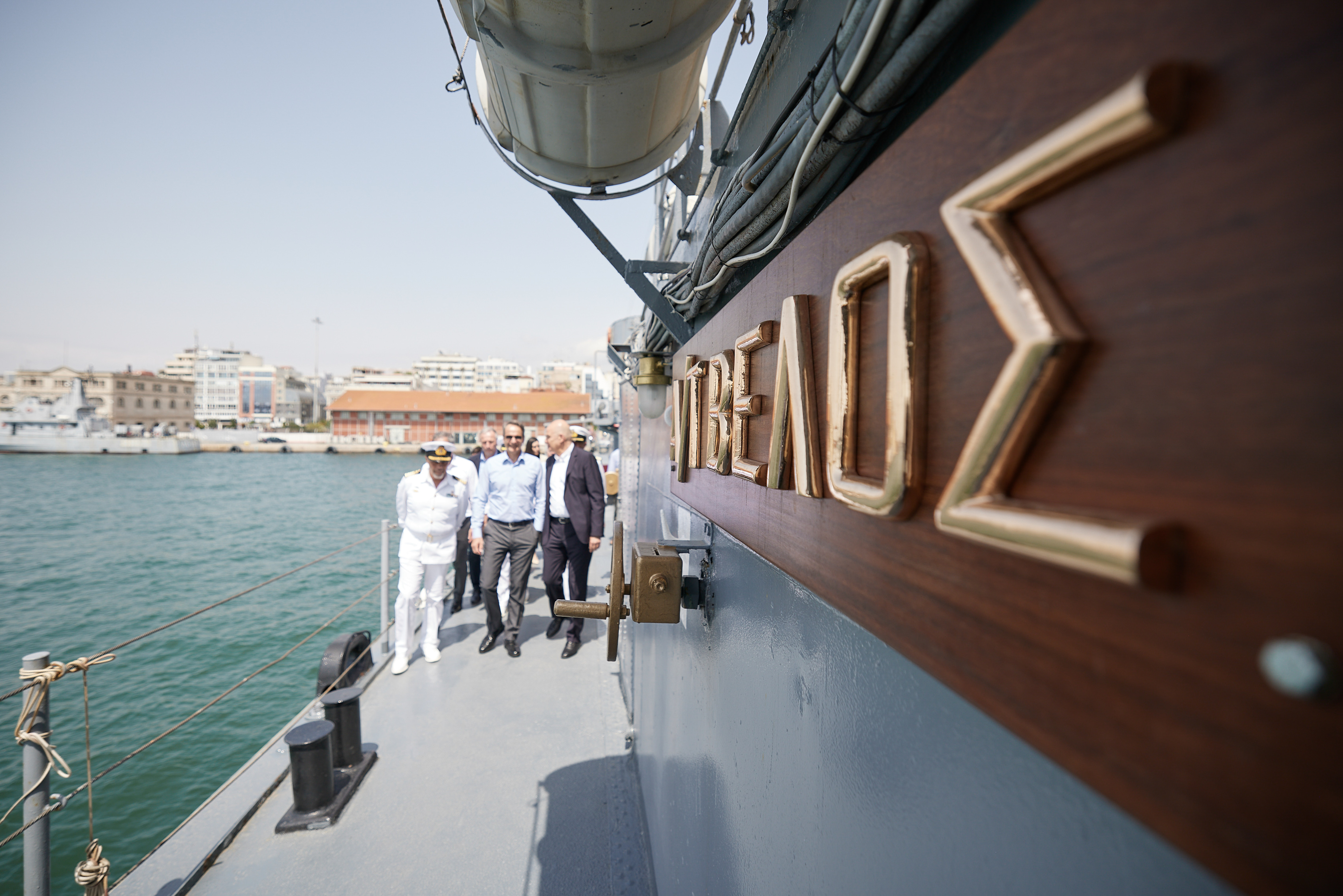 Τον Πρωθυπουργό υποδέχθηκε στο λιμάνι της Θεσσαλονίκης, ο Υπουργός Εθνικής Άμυνας Νίκος Δένδιας και μαζί επιβιβάστηκαν στο ιστορικό αντιτορπιλικό, που τον περασμένο Νοέμβριο είχε υποστεί σοβαρή ζημιά στην πρύμνη λόγω θυελλωδών ανέμων και θαλασσοταραχής.