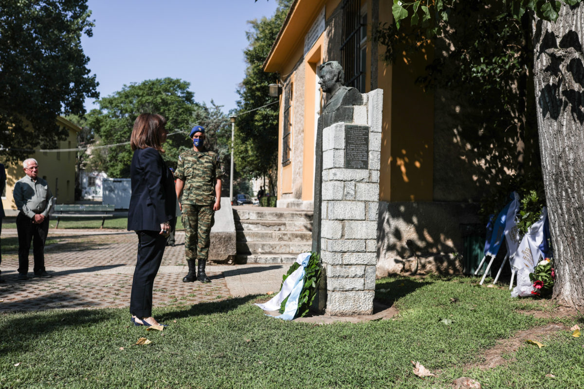 Με την ευκαιρία της 47ης επετείου αποκατάστασης της Δημοκρατίας, η Πρόεδρος της Δημοκρατία, Κατερίνα Σακελλαροπούλου κατέθεσε το πρωί στεφάνι στην προτομή του Σπύρου Μουστακλή, στα πρώην κρατητήρια ΕΑΤ – ΕΣΑ στο Πάρκο Ελευθερίας, αποτίοντας φόρο τιμής σε όλους τους αντιστασιακούς.