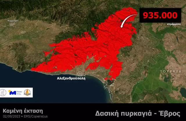 Πιο συγκεκριμένα, όπως προκύπτει από την ανάλυση των δορυφορικών δεδομένων, η συνολική έκταση που κατέκαψε η δασική πυρκαγιά του Έβρου, η μεγαλύτερη που έχει ξεσπάσει εδώ και πάρα πολλά χρόνια στην Ευρώπη, ξεπερνά τα 935.000 στρέμματα. Σημειώνεται η συνολική έκταση προέκυψε από τη συνένωση των πυρκαγιών σε Αλεξανδρούπολη και Δαδιά.