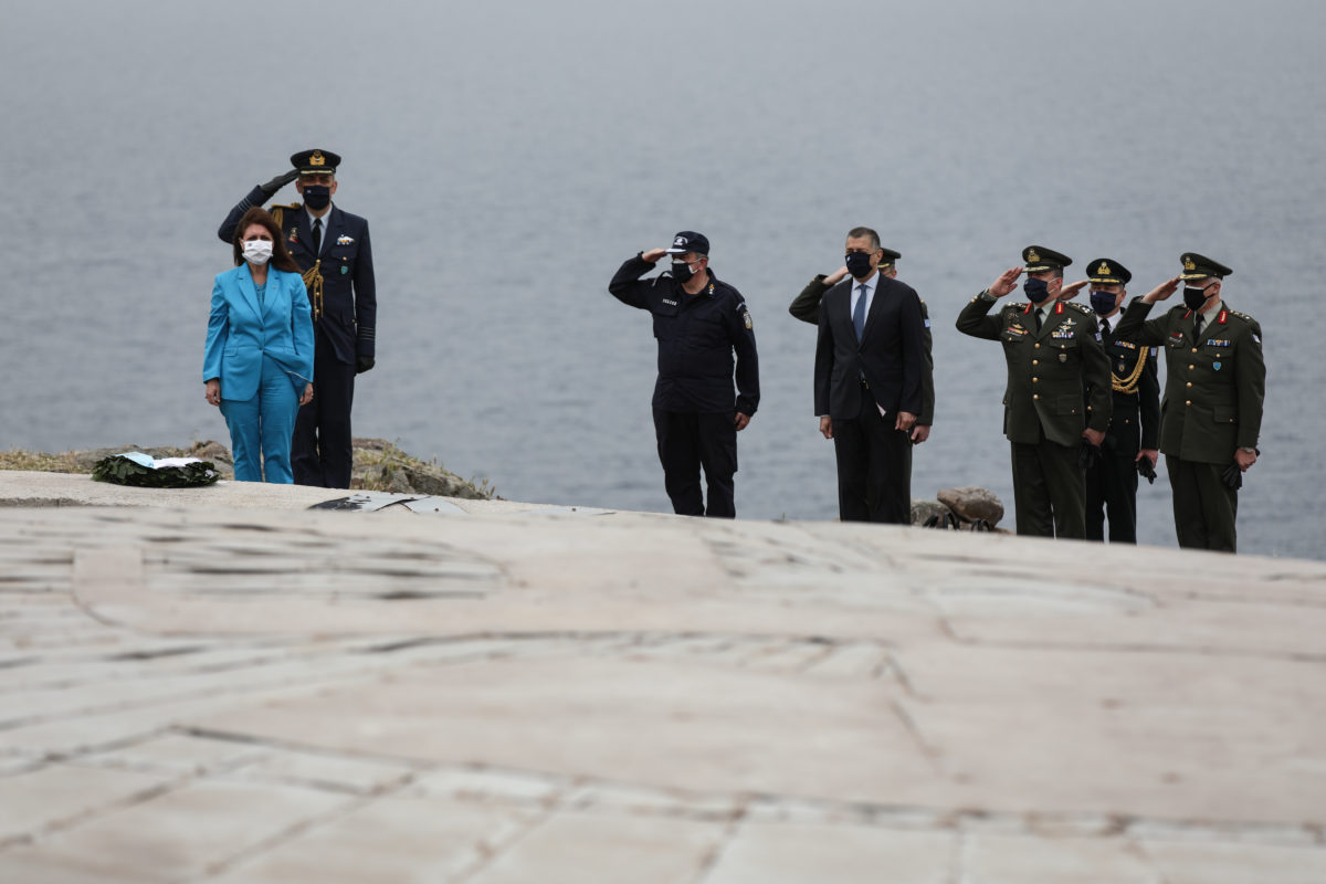 Καταθέτοντας στεφάνι υπό τους ήχους μιας σάλπιγγας η Πρόεδρος της Δημοκρατίας Κατερίνα Σακελλαροπούλου υποκλίθηκε με συγκίνηση «στη μνήμη του 27χρονου Υποσμηναγού που στις 18 Ιουνίου 1992, έχασε τη ζωή του εδώ, στη θαλάσσια περιοχή του Αϊ Στράτη, υπερασπιζόμενος τον εθνικό μας εναέριο χώρο από τουρκικά αεροσκάφη».