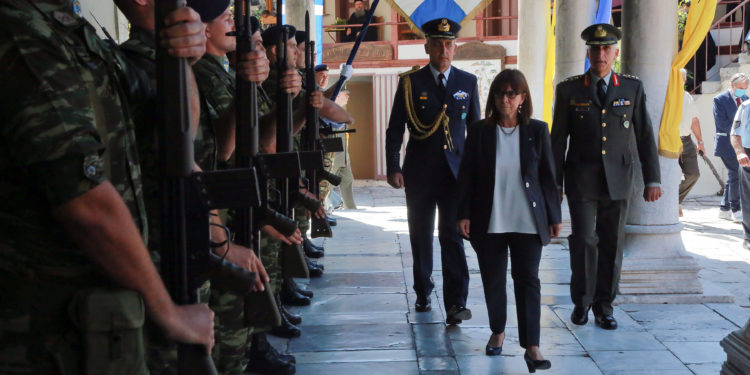 Η κ. Σακελλαροπούλου έκανε επίσης λόγο για «οφειλή όλων μας» στις ένοπλες δυνάμεις «που με αυταπάρνηση και ετοιμότητα βρίσκονται στην πρώτη γραμμή της υπεράσπισης της πατρίδας», ενώ αναφέρθηκε και στο «δυσανάλογο βάρος» που επωμίστηκαν τα νησιά στη διαχείριση της μεταναστευτικής και προσφυγικής κρίσης, σημειώνοντας παράλληλα πως «Οι νησιώτες μας επέδειξαν ευθύνη και αλληλεγγύη, σε καιρούς δύσκολους. Διαφυλάξαμε, στον Έβρο και το Αιγαίο, με αποφασιστικότητα και αποτελεσματικότητα, όχι μόνο τα δικά μας σύνορα, αλλά και τα σύνορα της Ευρώπης».