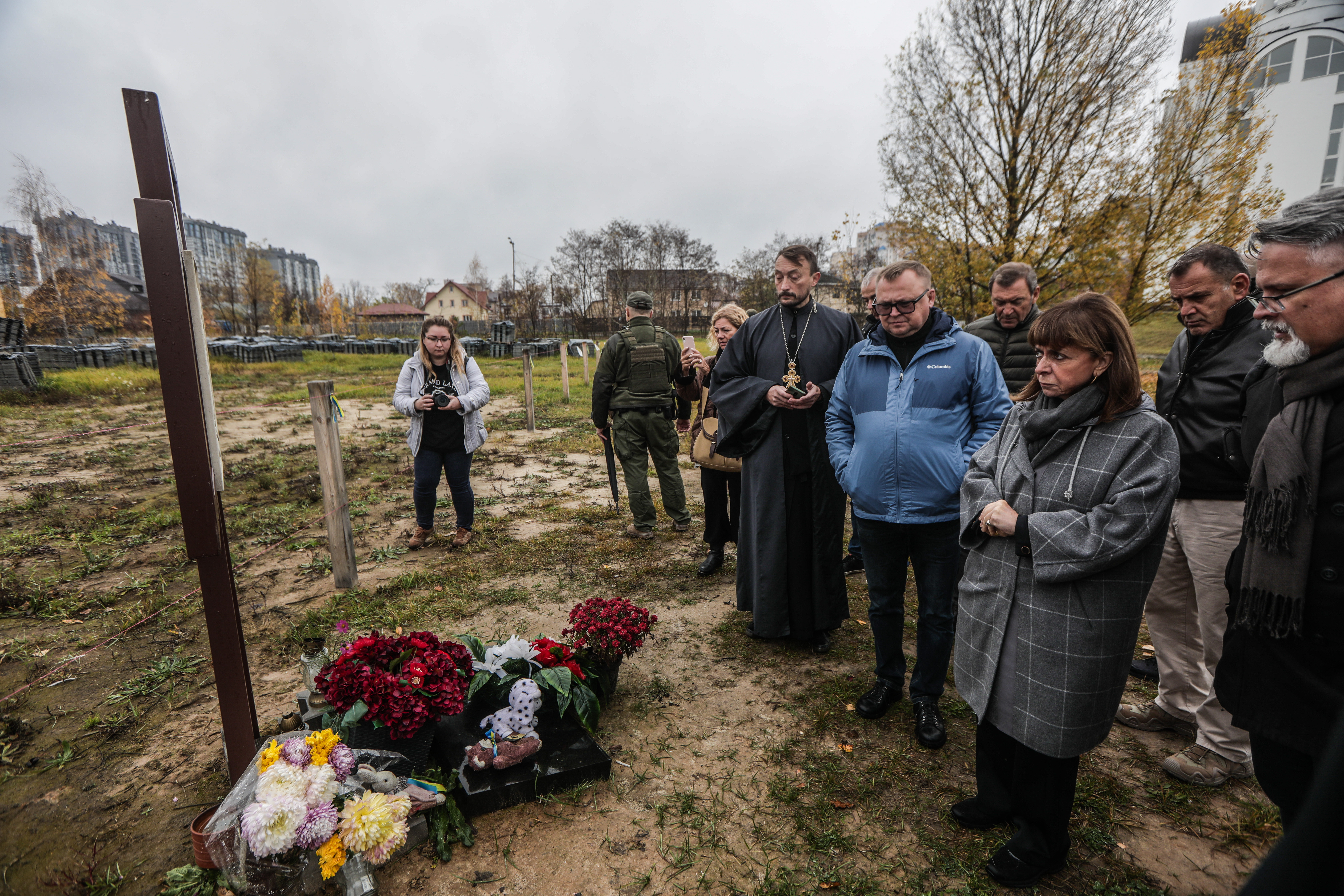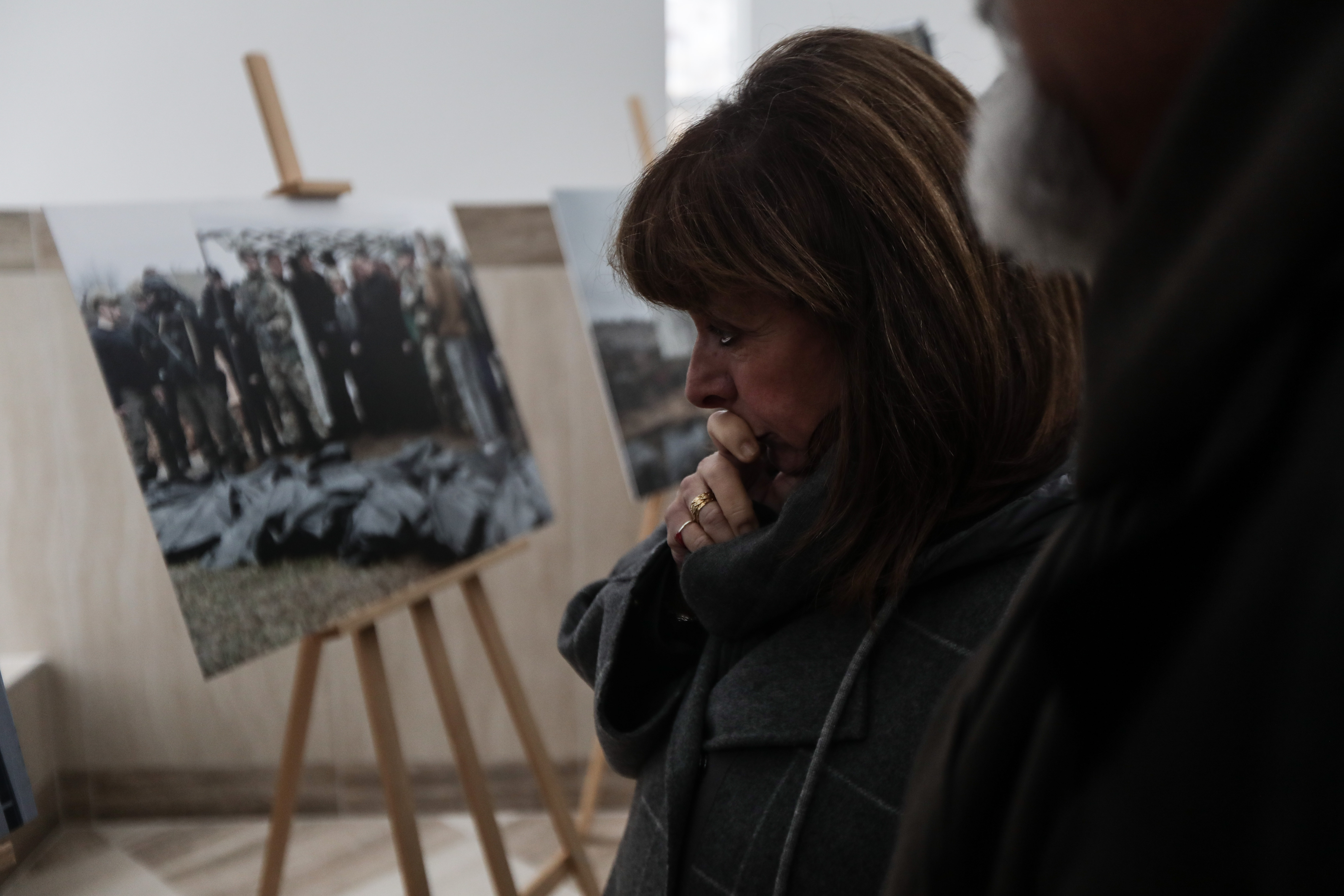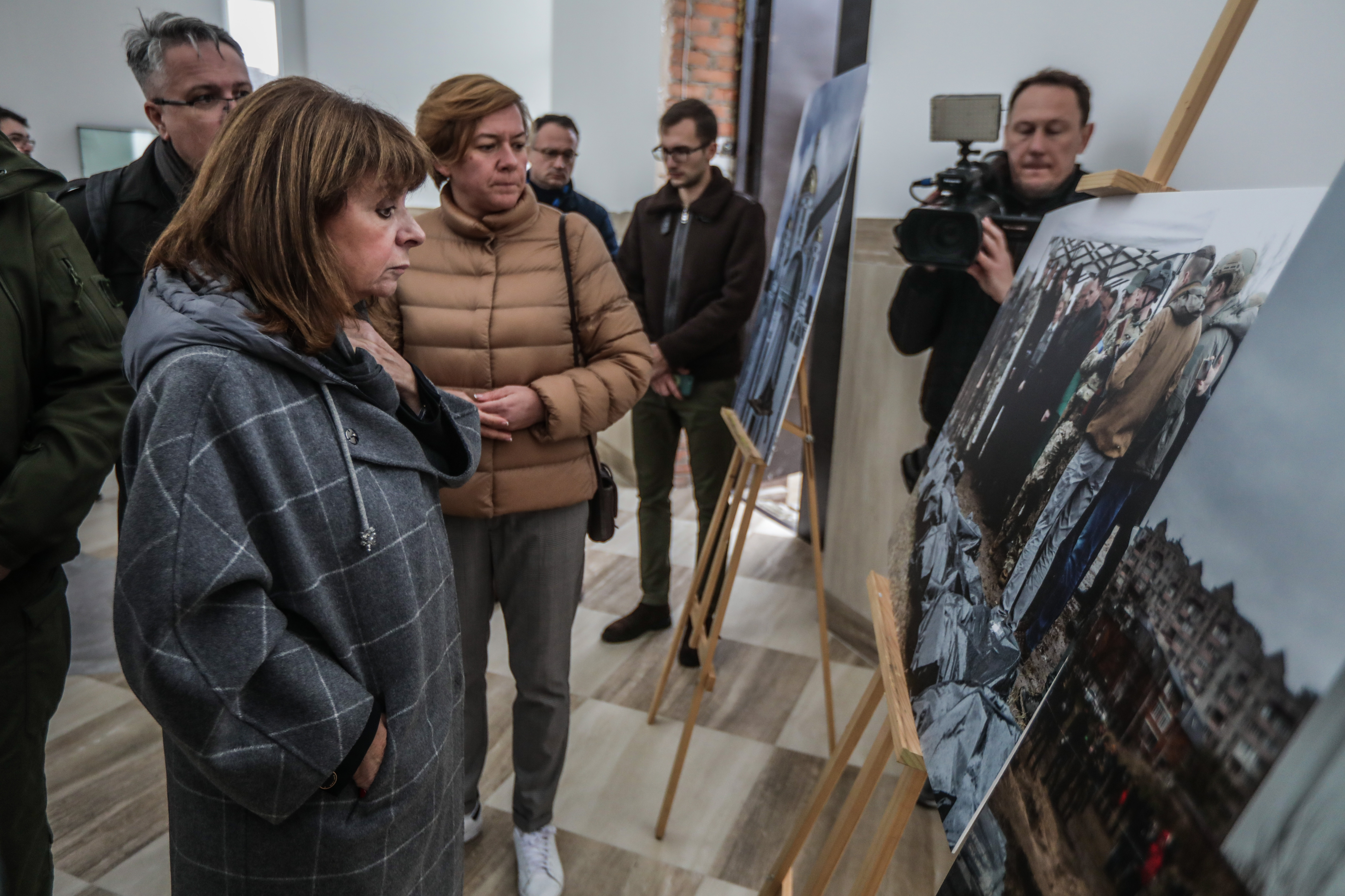 Στη Μπούτσα η κυρία Σακελλαροπούλου περιηγήθηκε στο σημείο που βρέθηκαν ομαδικοί τάφοι Ουκρανών πολιτών στον περίβολο της εκκλησίας του Αγίου Ανδρέα και είδε φωτογραφική έκθεση με αμάχους θύματα του πολέμου.