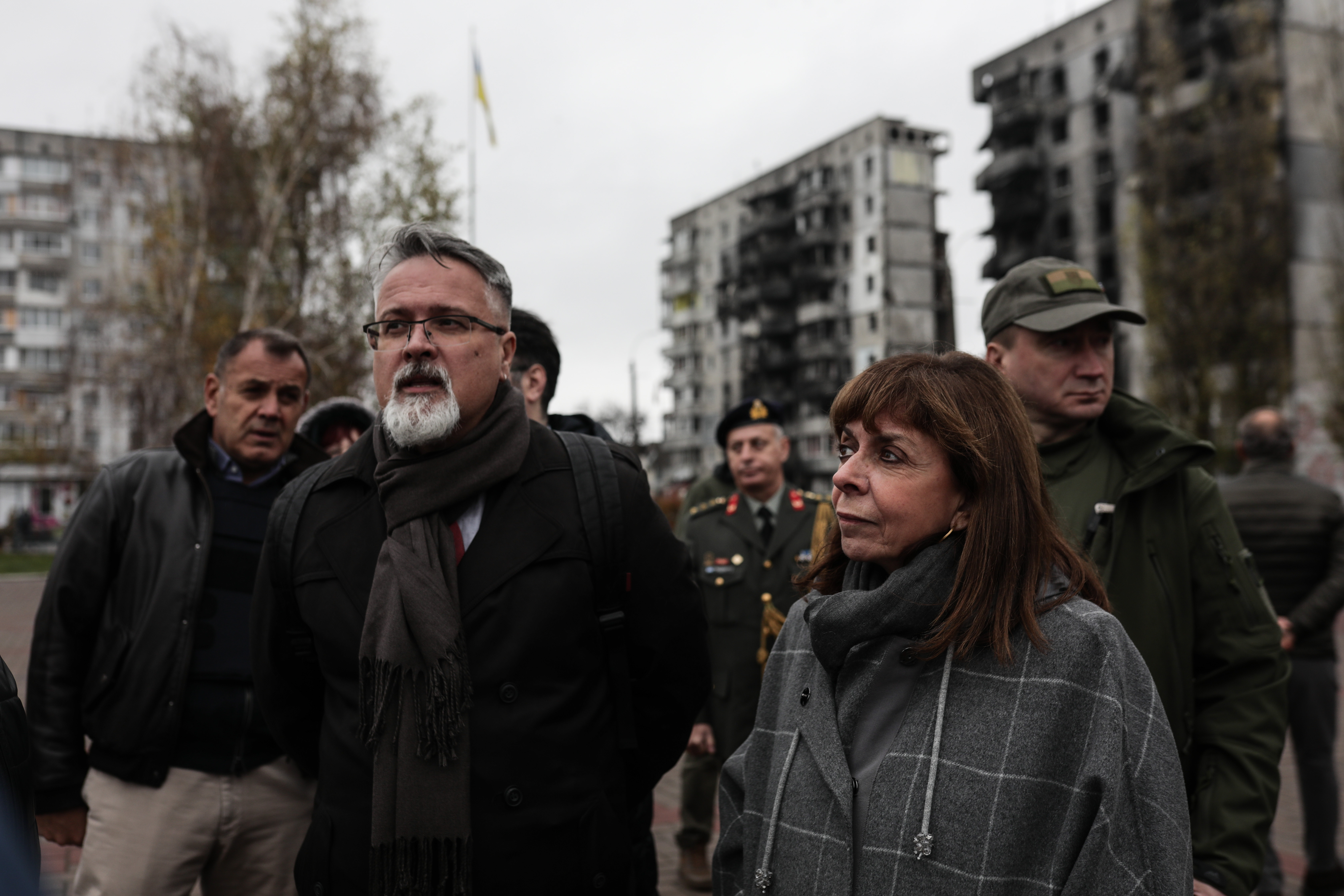 Η κυρία Σακελλαροπούλου μετέβη στις πληγείσες από τους ρωσικούς βομβαρδισμούς πόλεις Μποροντιάνκα, Μπούτσα και Ιρπίν, όπου είχε συνομιλίες με τις τοπικές αρχές και κατοίκους.