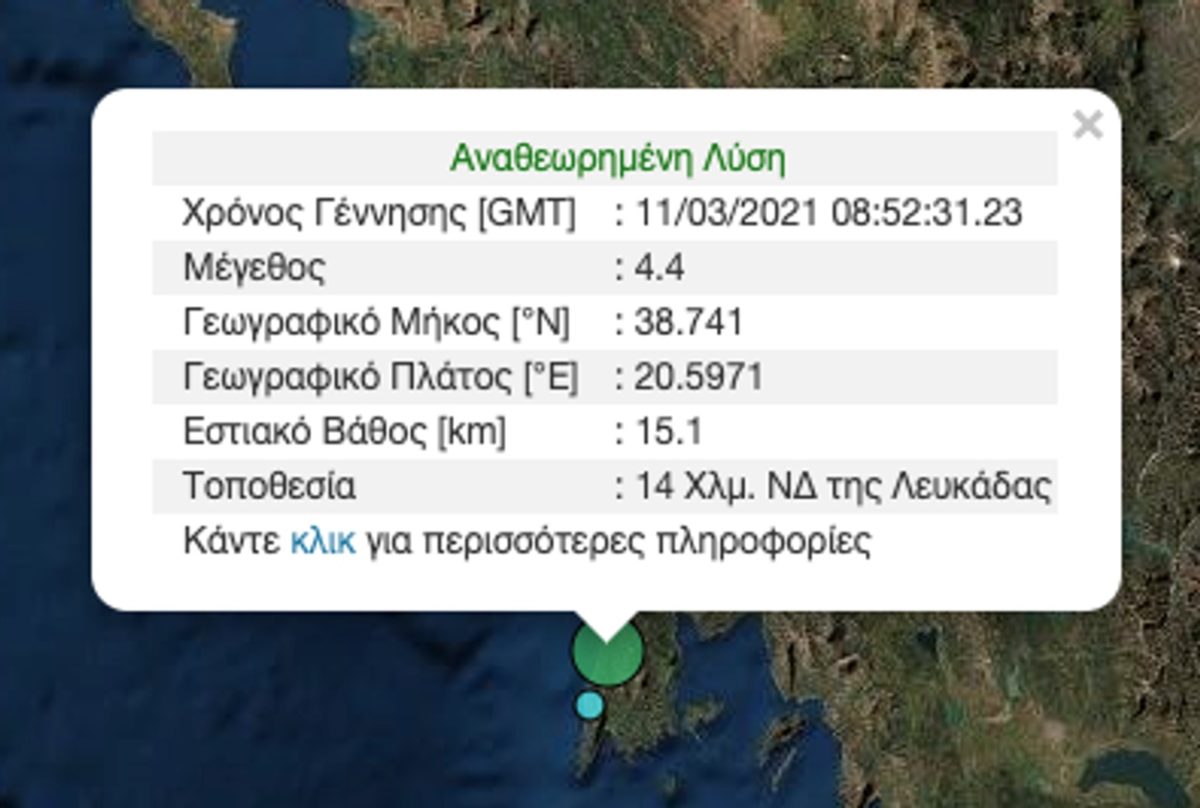Ο σεισμός έγινε σε απόσταση 285 χλμ. Δυτικά / βορειοδυτικά της Αθήνας και το επίκεντρο της δόνησης εντοπίζεται 14 χλμ. Νοτιοδυτικά της Λευκάδας.