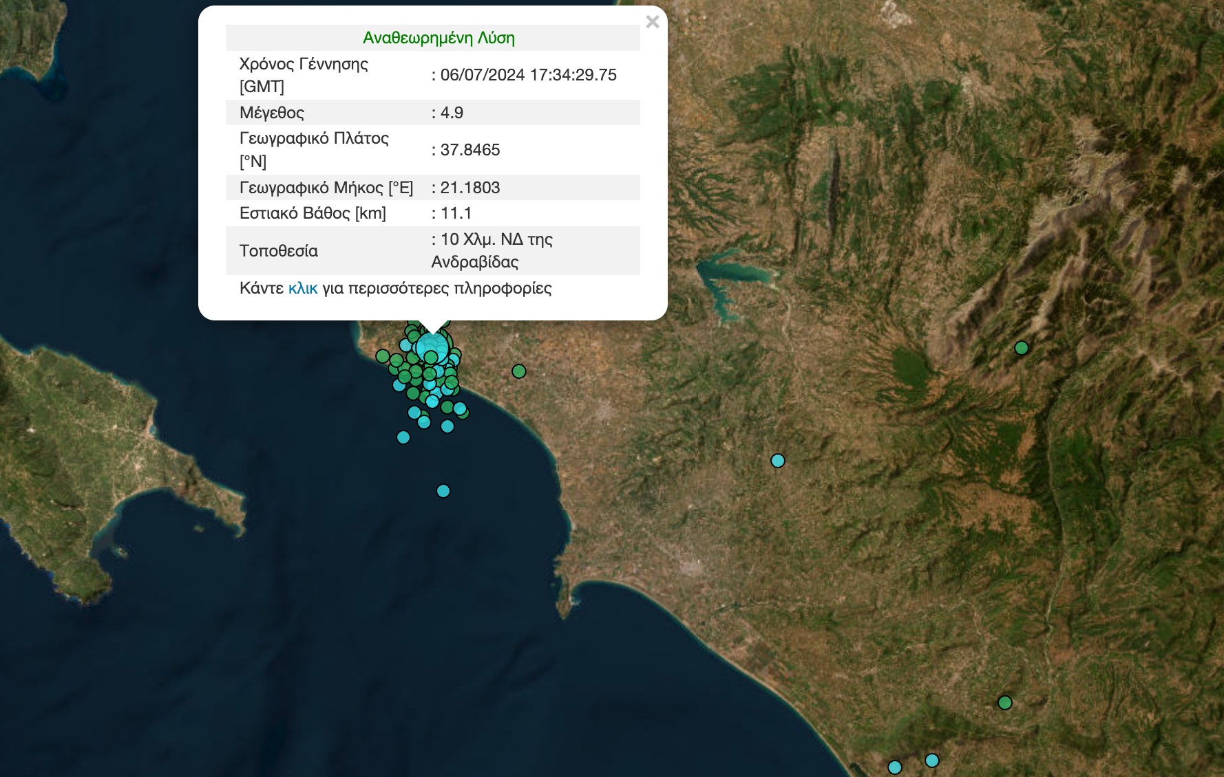 Το επίκεντρο του σεισμού, εντοπίζεται 12 χιλιόμετρα νοτιοδυτικά της Ανδραβίδας, στην περιοχή που και χθες (6 Ιουνίου 2024) είχε σημειωθεί σεισμική δόνηση 4,9 βαθμών της κλίμακας Ρίχτερ.