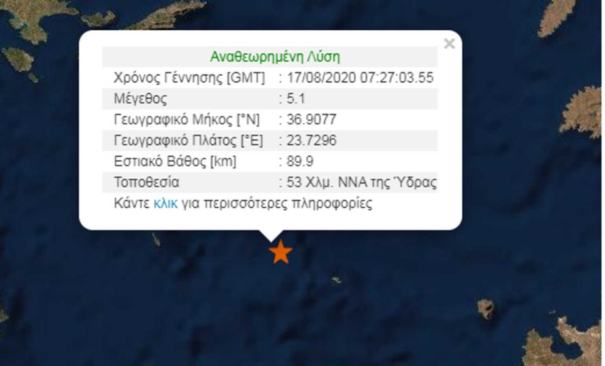 Όπως ανακοίνωσε το Γεωδυναμικό Ινστιτούτο του Εθνικού Αστεροσκοπείου Αθηνών ο σεισμός έγινε στις 10:27 και το επίκεντρό του εντοπίζεται στο θαλάσσιο χώρο 53 χλμ. ΝΝΑ της Ύδρας και 119 νότια της Αθήνας.