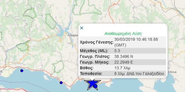 Σύμφωνα τα όσα αναφέρει το Γεωδυναμικό Ινστιτούτο ο σεισμός σημειώθηκε στις 12:46, είχε ισχύ 5,3 βαθμούς της κλίμακας Ρίχτερ και εστιακό βάθος 8 χιλιόμετρα νοτιοδυτικά του Γαλαξιδίου. Το εστιακό βάθος εντοπίζεται στα 13,7 χιλιόμετρα.