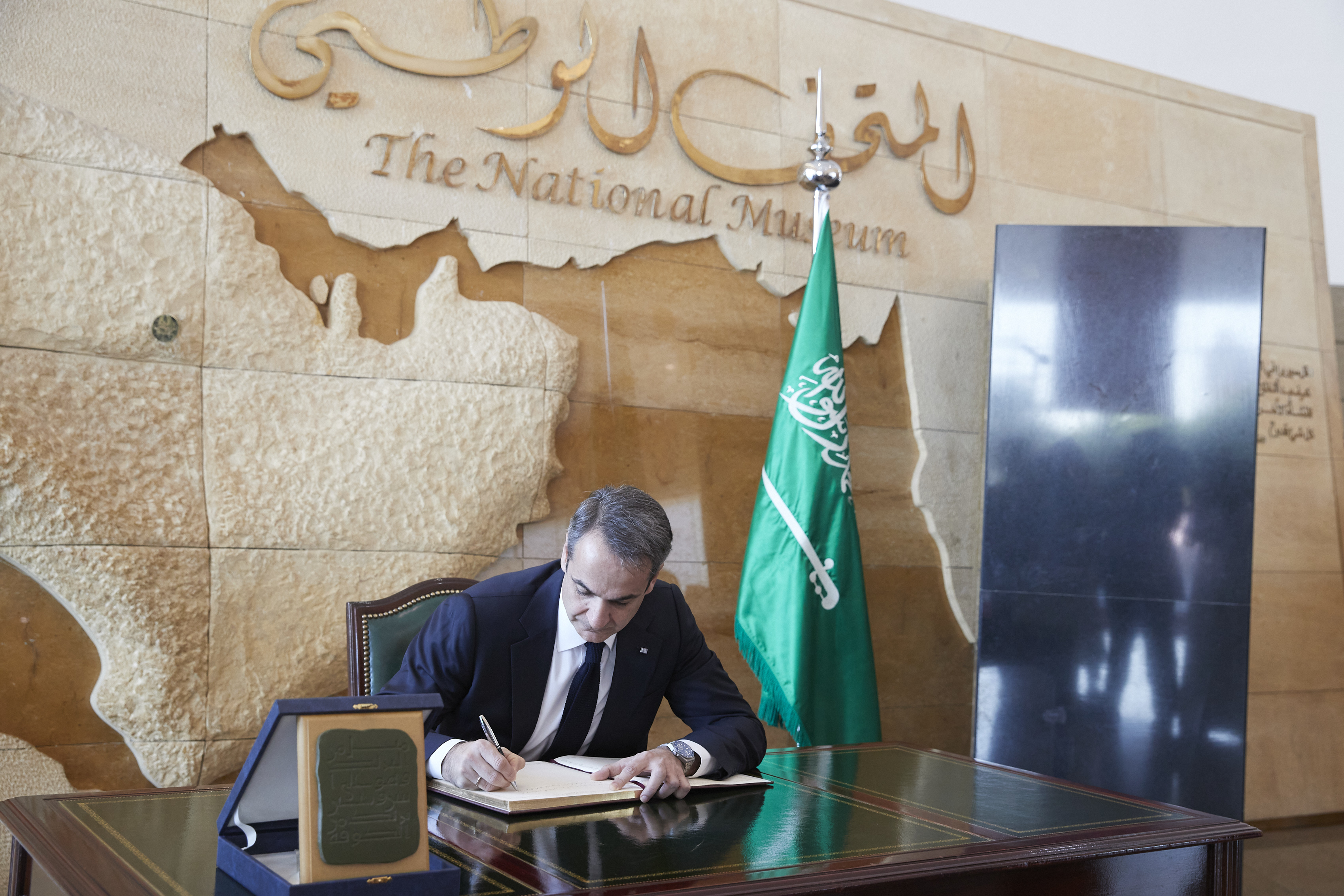 Ο κ. Μητσοτάκης ξεναγήθηκε στους χώρους, θαύμασε τα εκθέματα και έγραψε στο βιβλίο των επισκεπτών: «Ήταν τιμή μου να επισκεφθώ τον Εθνικό Μουσείο του Βασιλείου της Σαουδικής Αραβίας. Η Ελλάδα και η Σαουδική Αραβία μοιράζονται πολιτισμό που ανατρέχει πίσω στην ιστορία. Οι δεσμοί ανάμεσα στις δύο χώρες είναι ιστορικοί και μπορούν μόνο να ενισχυθούν».