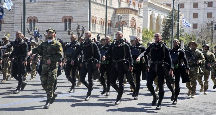 Αποθεώθηκε η Μονάδα Υποβρυχίων Αποστολών του Λιμενικού σώματος, τα περίφημα “βατράχια” που αφού πέρασαν μπροστά από τους επισήμους και μπήκαν στην οδό Πανεπιστημίου, τραγούδησαν το “Μακεδονία ξακουστή”.