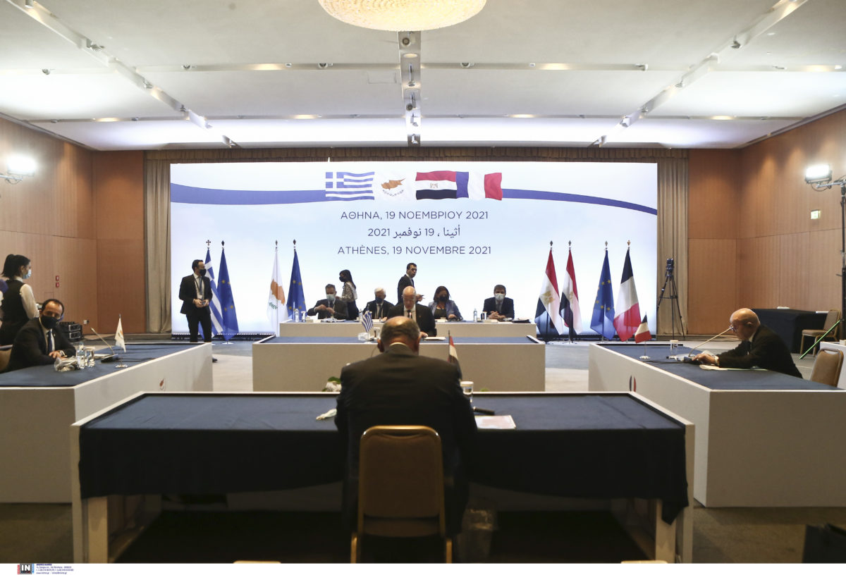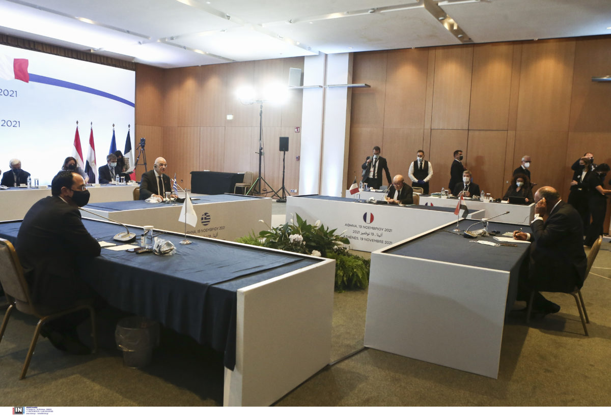 1. Σε συνέχεια της πρώτης μας συνάντησης, που πραγματοποιήθηκε τον Ιανουάριο του 2020 στο Κάιρο, και των αποτελεσμάτων και του τελικού ανακοινωθέντος, εμείς, οι υπουργοί Εξωτερικών της Ελλάδας, της Κύπρου, της Αιγύπτου και της Γαλλίας συναντηθήκαμε στην Αθήνα στις 19 Νοεμβρίου 2021, για να συζητήσουμε τις πρόσφατες εξελίξεις στην περιοχή, υπό το φως των πολύπλευρων προκλήσεων που επηρεάζουν την ειρήνη, τη σταθερότητα και την ασφάλεια.