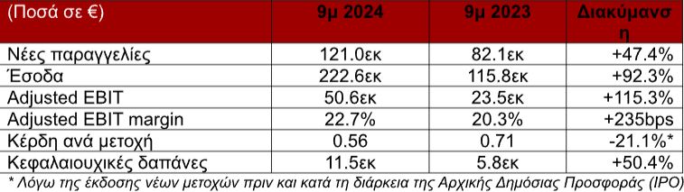 Η εταιρία πέτυχε ρεκόρ εσόδων ύψους €222,6 εκατ. στο 9μηνο του 2024, με 92% αύξηση σε σύγκριση με το 9μηνο του 2023 (€115,8 εκατ.) ως αποτέλεσμα νέων συμβολαίων που υπεγράφησαν και της άσκησης δικαιωμάτων προαίρεσης από υφιστάμενα συμβόλαια.