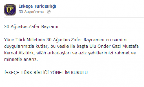 Γιά τήν ἡμέρα λοιπόν αὐτήν, ὁ ΠΑΡΑΝΟΜΟΣ σύλλογος «Τουρκική Ἕνωση Ξάνθης» (πρόεδρος ὁ δικηγόρος Ἀχμέτ Κούρτ) ἔβγαλε ἀνακοίνωση στό Facebook: