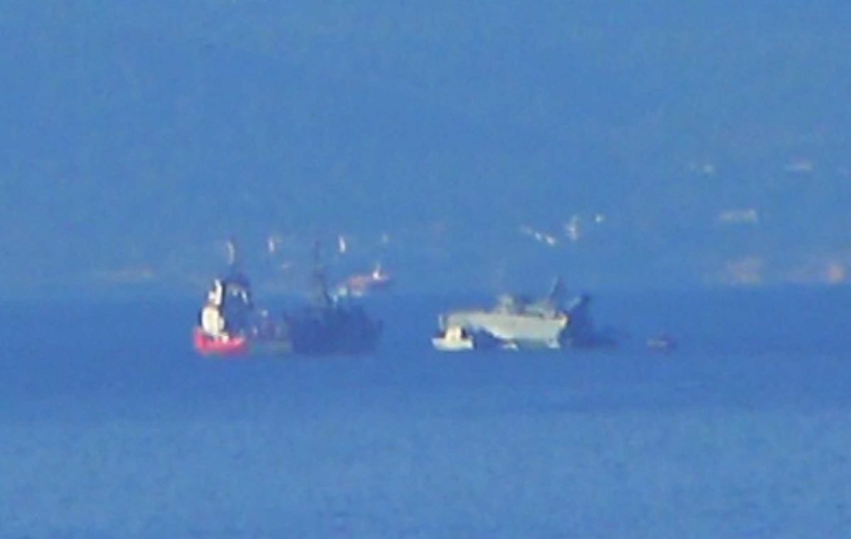 Οι πρώτες εικόνες δείχνουν το σημείο της σύγκρουσης και φαίνεται το πλοίο του Πολεμικού Ναυτικού να έχει κοπεί στα δυο και να έχει πάρει μεγάλη κλίση και να κινδυνεύει με βύθιση. Ωστόσο καταβάλλονται τιτάνιες προσπάθειες από το Πολεμικό Ναυτικό και το Λιμενικό Σώμα για να γίνει απάντληση υδάτων και να σωθεί το πλοίο.