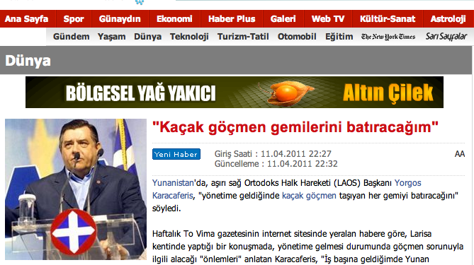 H τουρκική εφημερίδα Sabah κατηγορεί τον πρόεδρο του ΛΑΟΣ Γιώργο Καρατζαφέρη σχετικά με τις δηλώσεις του για τους λαθρομετανάστες. Η Sabah αναφέρει ότι ο «πρόεδρος του ακροδεξιού κόμματος ΛΑΟΣ , δήλωσε ότι αν έρθει στην κυβέρνηση θα βυθίσει κάθε πλοίο που φέρνει λαθρομετανάστες. Η τουρκική εφημερίδα υπενθυμίζει ότι ο Γιώργος Καρατζαφέρη έχει ταχθεί εναντίον του τεμένους στην Αθήνα.