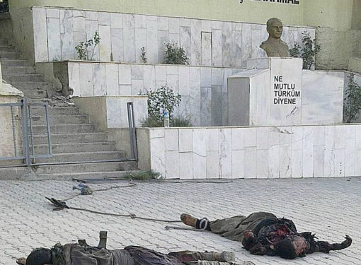 Δεν είναι σαφές πότε και που τραβήχτηκε η φωτογραφία. Δύο πτώματα ανταρτών δεμένα με σκοινί. Και από πίσω σ΄έναν ανδριάντα του Κεμάλ,τα λόγια πως ¨Η πατρίδα είναι μια ολότητα και δεν διαμελίζεται¨…. Σαν μια τελετή με κουρμπάνια….