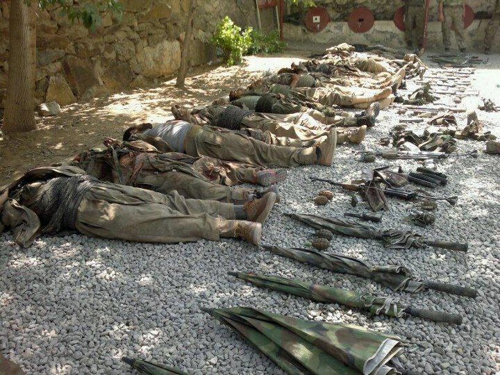 Η φωτογραφία δείχνει πτώματα Κούρδων ανταρτών μετά από μάχες με Τούρκους. Η λεπτομέρεια της φωτογραφίας είναι οι ομπρέλες παραλλαγής που βρέθηκαν στον εξοπλισμό τους. Είναι αυτές που τους επιτρέπουν να μην εντοπίζονται από θερμικές κάμερες, όπως γράφουν τα tourkikanea.gr