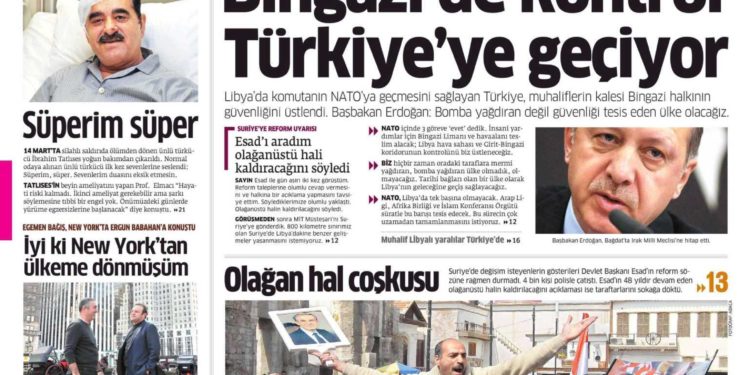 H εφημερίδα STAR έχει τίτλο » ο έλεγχος στη Βεγγάζη περνά στα χέρια της Τουρκίας» και γράφει πως η Άγκυρα που με τις πιέσεις της κατάφερε να φέρει τη διοίκηση των αεροπορικών επιδρομών στη Σμύρνη, θα εξασφαλίσει την ασφάλεια του λαού της Βεγγάζης. Η ίδια εφημερίδα φιλοξενεί τις δηλώσεις του Ερντογάν που τονίζει » δεν θα είμαστε η χώρα που θα ρίχνει βόμβες , αλλά η χώρα που θα δημιουργεί ασφάλεια στο λαό της Λιβύης»