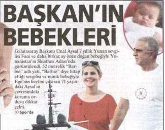 Το ταξίδι στην Ελλάδα και η εμφάνιση του ζευγαριού έγινε πρώτο θέμα στην εφημερίδα Milliyet με τίτλο « τα μωρά του προέδρου». Η τουρκική εφημερίδα αναφέρει πως «ο πρόεδρος της Γαλατάσαραϊ με το σκάφος του που έχει την ονομασία Barbie, και την ελληνίδα αγαπημένη του που την αποκαλεί Barbie και το μωρό τους κάνει κέφι στο Αιγαίο.»