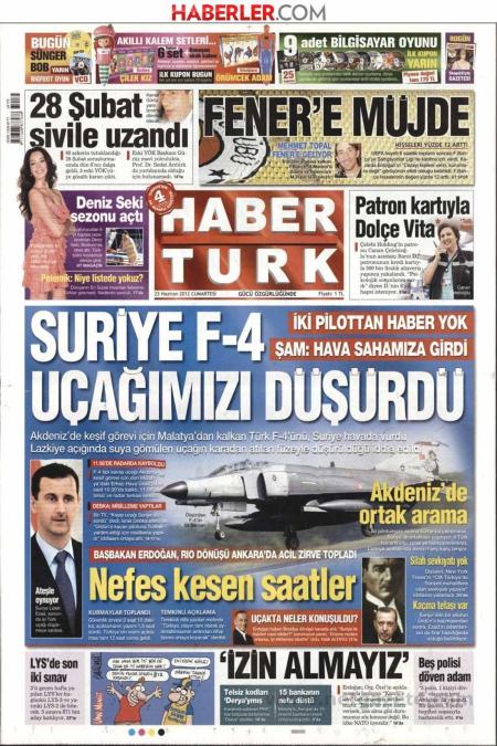 «Η Συρία κατέρριψε το αεροσκάφος μας τύπoυ RF-4» είναι ο τίτλος της Habertürk η οποία αναφέρει πως το αεροσκάφος το οποίο είχε απογειωθεί από τη Μαλάτια χάθηκε από τα ραντάρ ανοιχτά της Συρίας περίπου στις 12 το μεσημέρι. Η εφημερίδα γράφει πως το αεροσκάφος καταρρίφθηκε με αντιαεροπορικό πύραυλο.