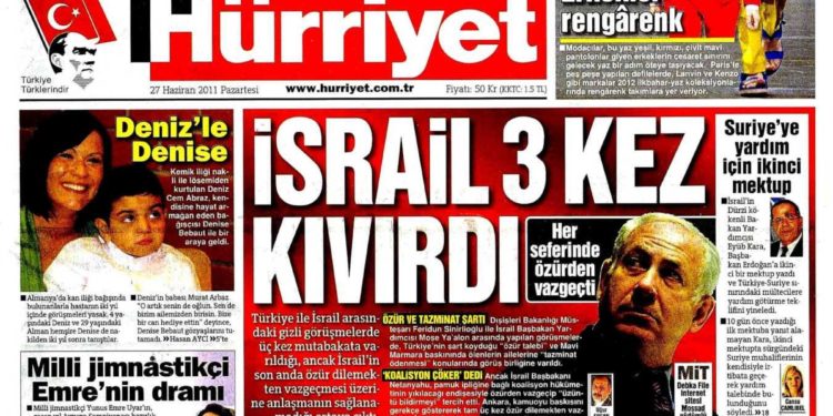 Η τουρκική εφημερίδα γράφει οτι ο γενικός γραμματέας του τουρκικού Υπουργείο Εξωτερικών Φεριντούν Σινιρλίογλου, με τον αντιπρόεδρο της ισραηλινής κυβέρνησης Μοσέ Γιαλόν, συναντήθηκαν πολλές φορές και κατέληξαν σε αποτέλεσμα. Η Ηürriyet γράφει οτι το Ισραήλ αποδέχθηκε να αποζημιώσει τα θύματα της επέμβασης στο πλοίο Mavi Marmara και να ζητήσει συγγνώμη απο την Τουρκία. Όμως ο Μπενιάμιν Νετανιάχου επικαλέστηκε τις εσωτερικές πιέσεις και άλλαξε γνώμη τονίζοντας οτι το Ισραήλ μπορεί να εκφράσει τη «λύπη του» για το ζήτημα.