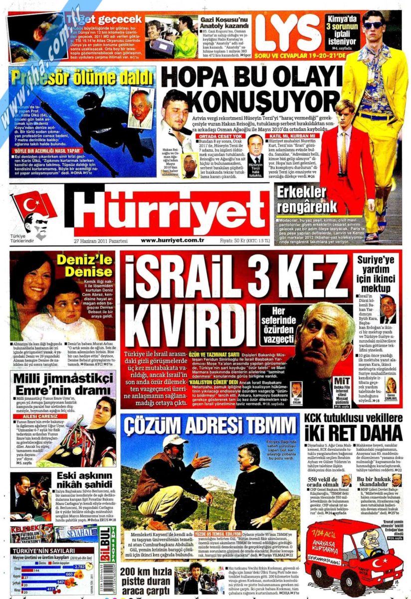 Η τουρκική εφημερίδα γράφει οτι ο γενικός γραμματέας του τουρκικού Υπουργείο Εξωτερικών Φεριντούν Σινιρλίογλου, με τον αντιπρόεδρο της ισραηλινής κυβέρνησης Μοσέ Γιαλόν, συναντήθηκαν πολλές φορές και κατέληξαν σε αποτέλεσμα. Η Ηürriyet γράφει οτι το Ισραήλ αποδέχθηκε να αποζημιώσει τα θύματα της επέμβασης στο πλοίο Mavi Marmara και να ζητήσει συγγνώμη απο την Τουρκία. Όμως ο Μπενιάμιν Νετανιάχου επικαλέστηκε τις εσωτερικές πιέσεις και άλλαξε γνώμη τονίζοντας οτι το Ισραήλ μπορεί να εκφράσει τη «λύπη του» για το ζήτημα.