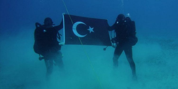 Εκεί λοιπόν οι Τούρκοι δύτες των ειδικών δυνάμεων SAS φωτογραφήθηκαν κρατώντας την Τουρκική σημαία στον βυθό του κόλπου της Σούδας.