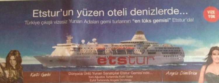 Η ETS, με διαφημίσεις σε ολοσέλιδες καταχωρήσεις σε τουρκικές εφημερίδες διαφημίζει τα κρουαζιερόπλοια της όπου κατά τη διάρκεια του ταξιδιού τραγουδούν η Άντζελά Δημητρίου και η Καίτη Γαρμπή!