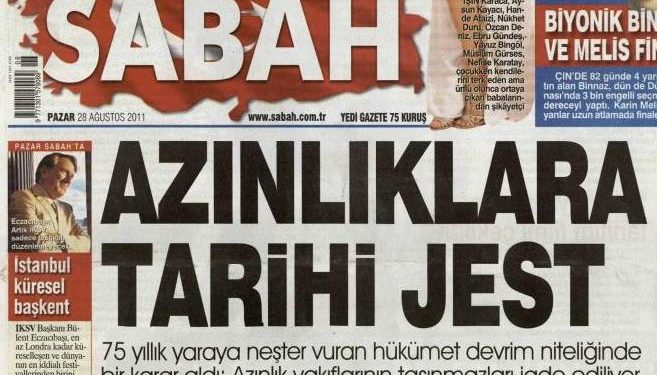 “Ιστορική απόφαση για τις μειονότητες» είναι ο τίτλος της τουρκικής εφημερίδας Sabah που με πρωτοσέλιδο της δημοσίευμα αποκαλύπτει πως η κυβέρνηση Ερντογάν αποφάσισε να επιστρέψει και να τα καταγράψει στο κτηματολόγιο στο ΄νομα των ιδρυμάτων , τα ακίνητα όλων των μειονοτικών ιδρυμάτων τα οποία τα είχαν δηλώσει το 1936. Αυτή η απόφαση αν εφαρμοστεί σημαίνει πως στα ελληνικά ιδρύματα στην Κωνσταντινούπολη θα επιστραφούν χιλιάδες ακίνητα, τα νεκροταφεία, τα οποία είχαν κατασχεθεί από το τουρκικό κράτος. Θα είναι μια μεγάλη δικαίωση των αγώνων του Οικουμενικού πατριαρχείου και των ιδρυμάτων που είχαν απωλέσει μεγάλο μέρος της περιουσίας τους μετά το 1936.
