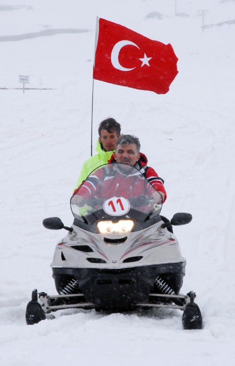 Στις φωτογραφίες , ο πρόεδρος της Δημοκρατίας Αμπντουλλάχ Γκιούλ στο χιονοδρομικό κέντρο του όρους Ερτζιγιές (φωτογραφίες από την Γενί Σαφάκ) .Όπως βλέπετε δεν αποχωρίζεται ποτέ τη τουρκική σημαία. Η υπερβολή χαρακτηρίζει τους Τούρκους,ακόμη και σε στιγμές χαλάρωσης.