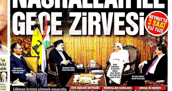 Ο τούρκος υπουργός Εξωτερικών μετέβει στον Λίβανο μαζί με τον πρωθυπουργό του Κατάρ Σεϊχι Ελ κατί. Αμέσως μετά ο Νταβούτογλου πήγε στο καταφύγιο του Νασράλα και οι δυο άνδρες μαζί με τον πρωθυπουργό του Κατάρ συνομίλησαν για τρείς ώρες.