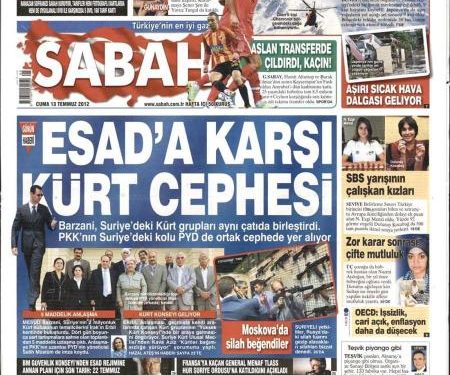 »Κουρδικό μέτωπο εναντίον του Άσαντ» είναι ο τίτλος της Sabah. H τουρκική εφημερίδα γράφει » ο Μπαρζάνι ένωσε τις Κουρδικές οργανώσεις κάτω απο μια στέγη» και ισχυρίζεται πως οι Κούρδοι ενώνονται εναντίον του Άσαντ. Τo παρακλάδι του PKK στη Συρία δεν θα έχει καμία διαμάχη με τις υπόλοιπες κουρδικές οργανώσεις.